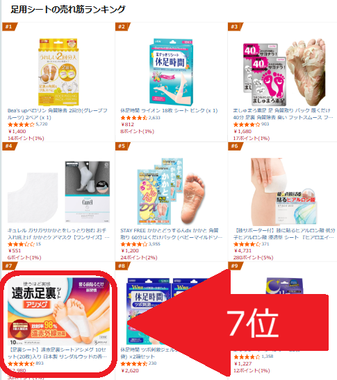 Amazonの売れ筋ランキング「足用シート」全体でアシメグは7位です。