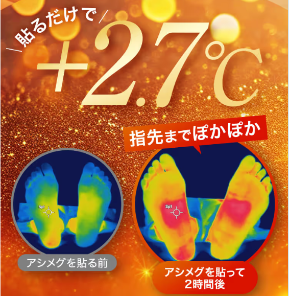 アシメグは、足裏に貼るだけで足の表面温度が平均+2.7℃上がったというデータがあります。